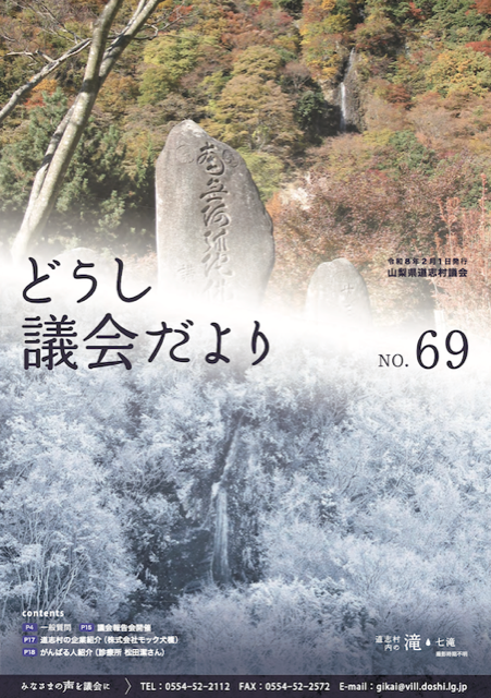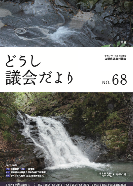 【表紙】道志村内の滝 (椿地内 雄滝・雌滝) ▶5月臨時会 ・公の施設の指定管理者の指定について (道志村買い物環境施設 ローソン道志店) 他 ▶6月定例会 ・令和7年度道志村一般会計補正予算(第1回) 他 ▶一般質問 ▶議会活動報告 ▶あの一般質問は今・・・ (森林整備計画は) おもな活動 ▶活躍する団体紹介 ・道志村建設業協会 会長 志村 茂さん ▶村民の声 ▶がんばる人紹介 ・(株)どうし養魚場 代表取締役 霧生 義明さん 令和7年7月1日 |